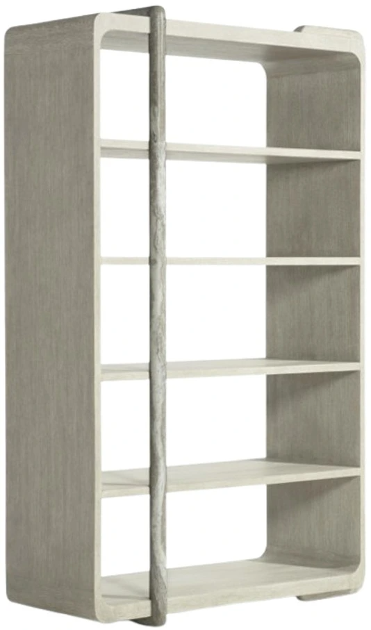 Wrapped shapes and a textural style give the Arcadia etagere a standout design in oak and faux stone. A rounded wood brace in cay finish curves over one side of the case, while a faux stone post in kalta encircles the front and back.Read More