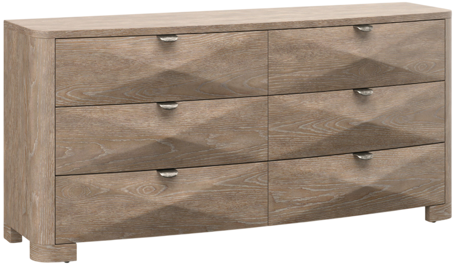 Dimensional pyramid shaping draws all eyes to the Aventura dresser. The design offers a curved front with six drawers with dimensional cast resin drawer fronts and metal tab pulls. A Marcona finish adds a chic but rustic look as the perfect final touch.Read More