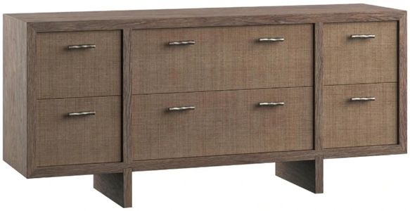 Taking a minimalist approach, the Casa Paros dresser appears to float above two leg panels. Six soft-close drawers in two sizes have woven panels behind cast metal hardware in an organic shape. The design offers both natural textures and subtle wood grains.Read More