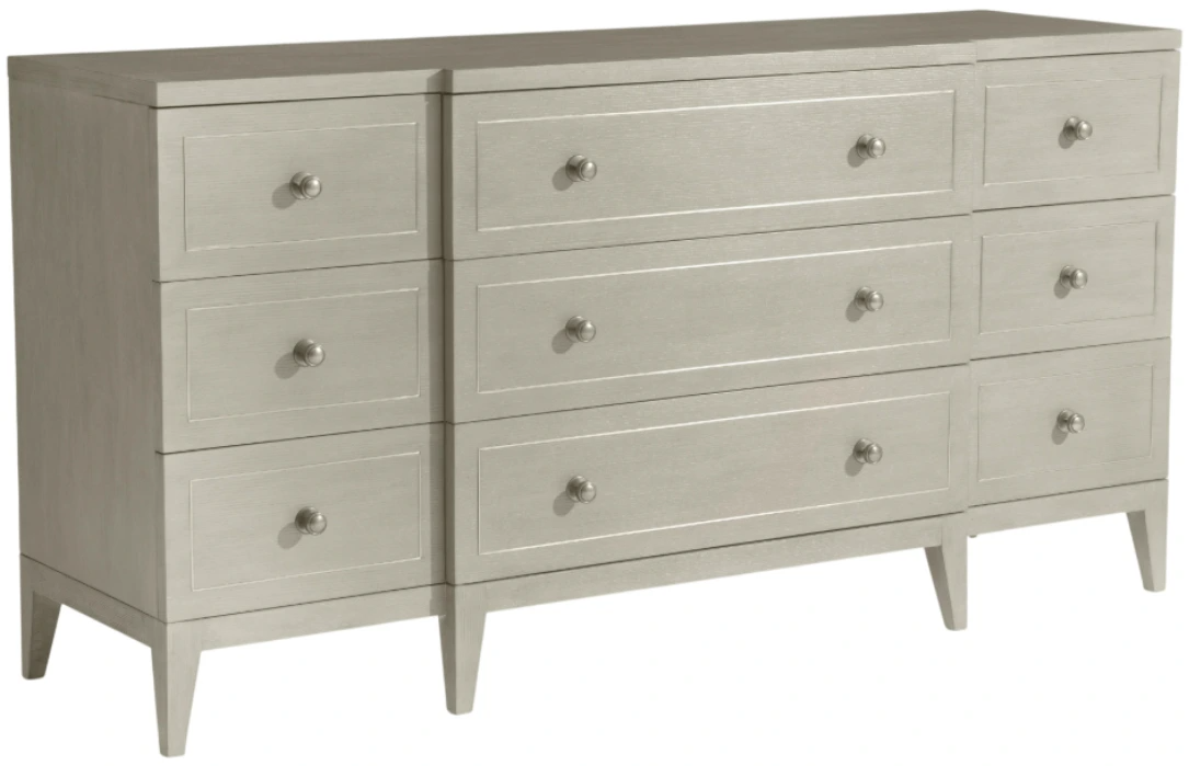 The Cornelia dresser has a traditional breakfront design that is updated for modern living with brushed stainless steel metal inlays around its nine drawers. Lines are sleek and refined, while the Nebbia finish gives the piece a more casual style.Read More