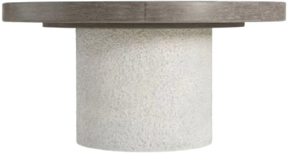 Simple forms are refashioned into an alluring design for the monolith dining table. A circular faux stone pillar showcases beautiful texture in the millstone finish. A round top in puma-finished wood can be expanded to an oval shape with the addition of one leaf.Read More