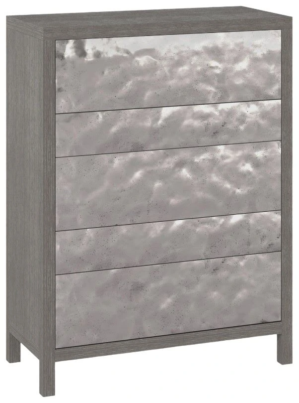 The Prado tall drawer chest molds the idea of modern rustic into a new form. Five push-to-open drawers have textured cast aluminum drawer fronts, finished in bright graphite. Three larger drawers and two smaller drawers alternate on the chest, with the case finished in porcini.Read More