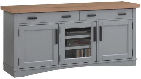 Give your living area an instant refresh with the addition of the Americana Modern 63-inch tv console with power center. A tastefully designed media option, it features closed storage, glass doors for media components, and a soft dove grey finish accented with a contrasting wood-grain top and metal hardware.Read More