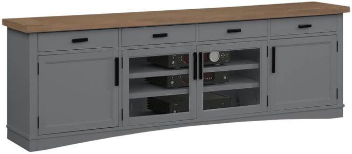 Show off your entertainment system in fashionable style with the Americana Modern 92-inch TV console. In a dove gray finish with contrasting wood-grain top and metal hardware, it creates a look of timeless elegance.Read More