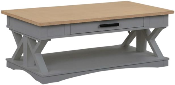 Destined to be the heart of any conversation area, the Americana Modern cocktail table is a must-have. Crafted in a versatile dove gray finish, it features a contrasting wood-grain top in weathered natural. A lower open area is perfect for storage and display.Read More